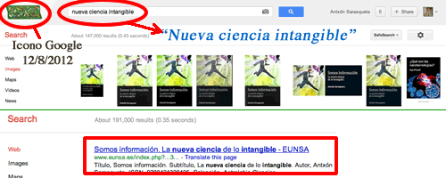 El día que se clausuraban los Juegos Olímpico Londres 2012, el 12 de Agosto, el mensaje del libro Somos información. La nueva ciencia de lo intangible, estaba situado en el Nº1 de Google en español, entre las referencias e imágenes del buscador líder al introducir el término ‘nueva ciencia intangible’.
