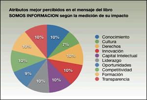 - El 100% de los mensajes registrados en esta primera medición del impacto, incluidos los reproducidos de la propia obra, y las valoraciones de los medios en reseñas, críticas, entrevistas, y otras informaciones de distintas fuentes, que los relacionan con materias de orden científico y educativo, o segmentos sociales y económicos, coinciden todos con el título del libro y los atributos más representativos del mismo.